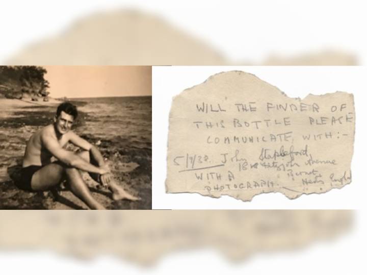 Во шишето ја пронашол пораката, напишана на рака од 5 септември 1938 година во која пишува: Може ли пронаоѓалот на оваа порака да биде љубезен и да го контактира Џон Стипфорд, Авенија Финдон 18, Барнет, Англија и да му ја предаде оваа фотографија.