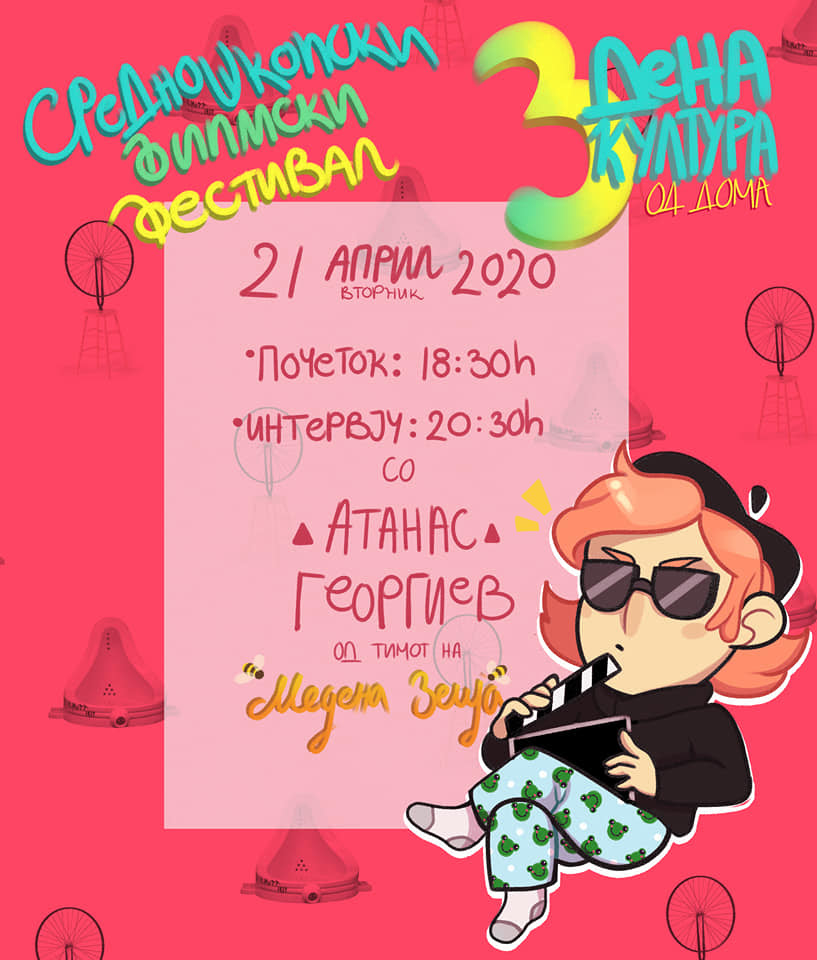Со проекција на кратки аматерски средношколски филмови и интервју со Атанас Георгиев, продуцент и монтажер на „Медена земја”, денеска на социјалните мрежи почнува фестивалот „Три Дена Култура од Дома”.