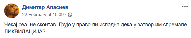 -Чекај сеа, не сконтав. Грујо у право ли испадна дека у зaтвop им спремале ЛИKBИДАЦИJA, пишува Апасиев на Фејсбук.
