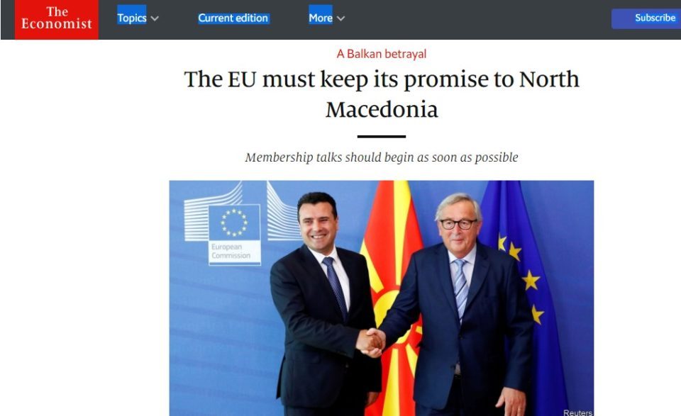 Потсетува дека на земјата и беше ветено дека со исполнување на обврските ќе може да ги почне преговорите со ЕУ и пристапувањето во НАТО, што му овозможи на премиерот Заев да го истурка дома Договорот од Преспа. Во јуни 2018 година препораката за почеток на преговорите беше одложена за една година. Но, сега е можно понатамошно одложување, а таквиот чекор, не само што е нефер, туку и опасен, предупредува „Економист”.