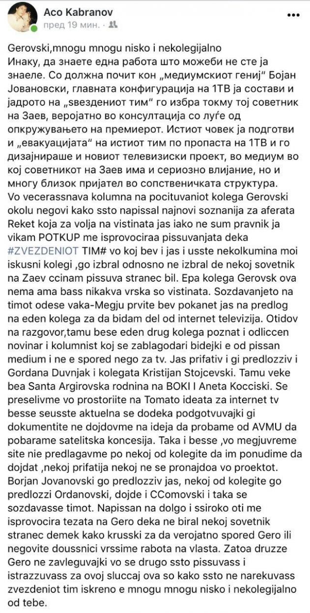 Поранешниот главен уредник на 1ТВ, Ацо Кабранов за новиот текст на Бранко Героски каде напиша дека јадрото на тимот на 1 ТВ го составил советник на Заев, рече дека е низок удар и неколегијално. Кабранов не се согласува со пишувањата на Героски дека странец го составил јадрото на новинарскиот тим на 1ТВ.