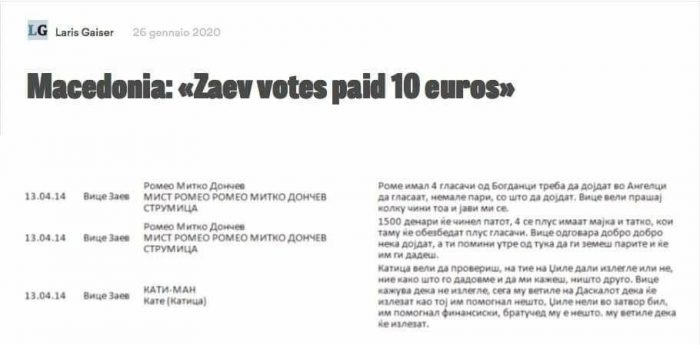 – Анализираните документи опишуваат сценарио во кое тогашниот лидер на СДСМ и градоначалник на Струмица, осомничен за изборни измами, се служел со нерегуларни средства за да биде избран во Собранието, за потоа да стане премиер. Гласачите кои одлучиле да соработуваат биле плаќани, за секој глас поединечно, од 10 до 25 евра, во две менувачници раководени една од Вице Заев и една од негов колега. Една од двете менувачници, ‘Даскал’, е во сопственост на Марјан Даскаловски, кој исто така бил избран за пратеник во Собранието заедно со Заев, и бил претседател на локалниот огранок на СДСМ. Во случај сумата да не била доволна да се убедат граѓаните, се одело и до таму да се понудат градежни матетријали за градење куќи или пак поврзување на домовите со комуналната инфраструктура. Човекот што бил главен за испазареното поврзување со или исклучување од комуналната инфраструктура, оној што ги контролирал вработените во општината е директорот на ЈП Комуналец-Струмица, Зоран Георгиев. Тој, служејќи се со службените ресурси што му биле на располагање, се заканувал или ги казнувал тие што се двоумеле дали да соработуваат при гласањето, а секако ги наградувал оние другите. Во Македонија Георгиев е познат по тоа што бил шеф на сите изборни кампањи на Заев и дека е сопруг на судијката од судот во Струмица, Лорета Георгиева, која во времето на владеењето на Зоран Заев станува член на Судскиот Совет, институцијата која има задача да го контролира работењето и ефикасноста на македонските судии – пишува италијанскиот весник.