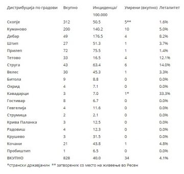 Заклучно со 11.04.2020, пријавени се вкупно 828 случаи. Најголем дел од нив се регистрирани во Скопје и Куманово, додека највисок морталите (со исклучок на странскиот државјанин од Кавадарци) се регистрира во Струга и Тетово.