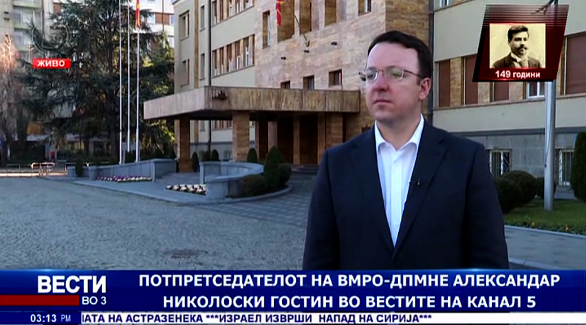 Потпретседателот на ВМРО-ДПМНЕ, Александар Николоски попладнево гостуваше во вестите на Канал 5 телевизија.
