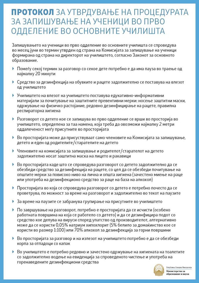 Според протоколот, уписот се спроведува во термин утврден од Комисија за запишување ученици формирана од директорот на училиштето. Треба да има пауза од најмалку 20 минути помеѓу термините за разговор на членовите на комисијата со секое дете. Во паузите се забранува групирање на присутните во училиштето.