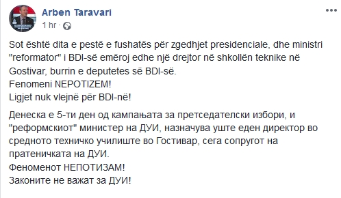 -Денеска е 5-ти ден од кампањата за претседателски избори, и “реформскиот“ министер на ДУИ назначува уште еден директор во средното техничко училиште во Гостивар, сега сопругот на пратеничката на ДУИ! Феноменот НЕПОТИЗАМ! Законите не важат за ДУИ!, напиша Таравари на својот Фејсбук профил.