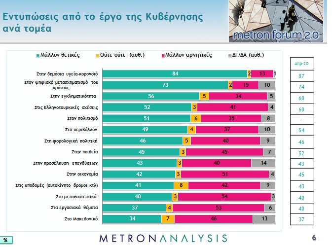 Економијата за четири од десет Грци е најважниот проблем за земјата, пред епидемијата; 84 отсто од граѓаните се против предвремени парламентарни избори; Владата добива негативна оцена за македонското прашање; 64 проценти сметаат дека земјата оди во правилна насока, владејачката Нова демократија е во предност од речиси 20 проценти пред СИРИЗА, покажуваат резултатите од истражувањето на јавното мислење спроведено од агенцијата „Metron Analysi“ за грчката телевизија „Мега“, јави дописничката на МИА од Атина.