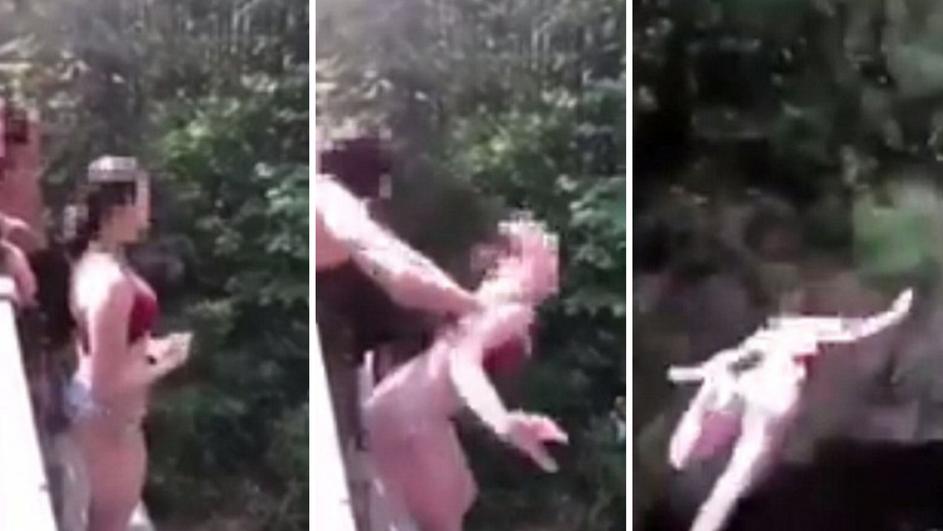 Една девојка стоела на работ, а останатите позади неа. Девојката иако неколку пати извикала дека не сака да скокне од мостот, но нејзините пријатели упорно ја убедувале.